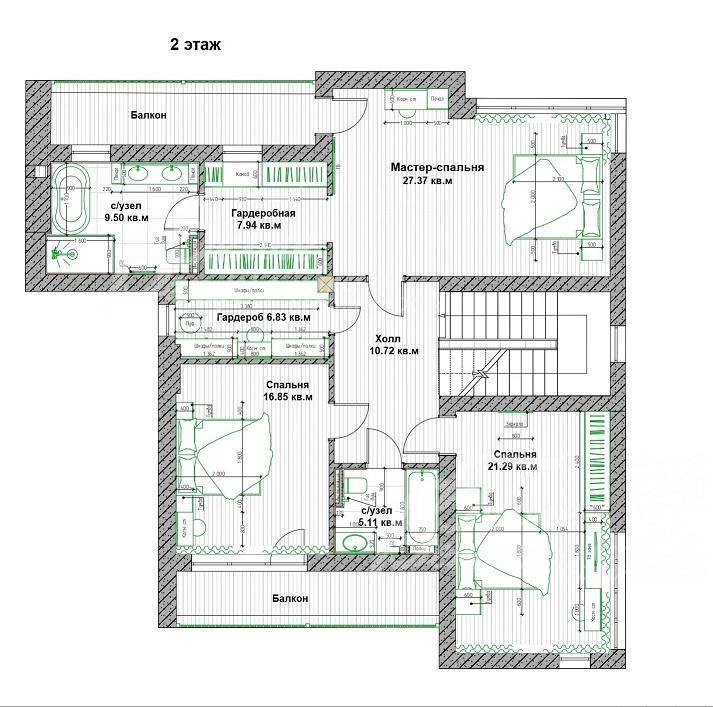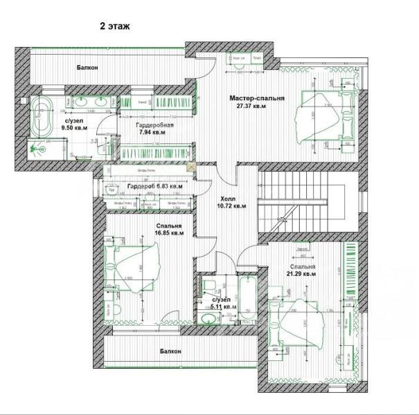 2-ой этаж: холл 11 кв.м, мастер-блок: спальня 27 кв.м с ванной 9.5 кв.м, гардеробной 8 кв.м и выходом на балкон, две спальни 21 кв.м и 17 кв.м, санузел 5 кв.м, гардеробная 7 кв.м