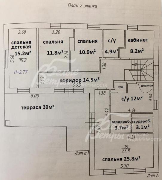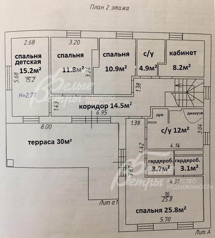 2-ой этаж: спальня 15 кв.м, спальня 12 кв.м, спальня 11 кв.м, санузел 5 кв.м, кабинет 8 кв.м, санузел 12 кв.м, спальня 26 кв.м, гардеробные 4 и 3 кв.м, коридор 14.5 кв.м, терраса 9 кв.м,