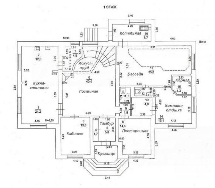 1-ый этаж: крыльцо с гранитными ступенями, тамбур 5 кв.м, встроенный шкаф, гостиная 40 кв.м с камином, отделанным мрамором, и с декоративным фонтаном, кухня-столовая 36 кв.м, кладовая 4.5 кв.м, кабинет 14 кв.м, с/узел, СПА зона: комната отдыха 15 кв.м с джакузи и душевой, парная с парогенератором, тренажерная с бассейном 35 кв.м (глубина 1.5 м, чаша 6х3), с/узел, постирочная/гладильная 14 кв.м, котельная с выходом в сад