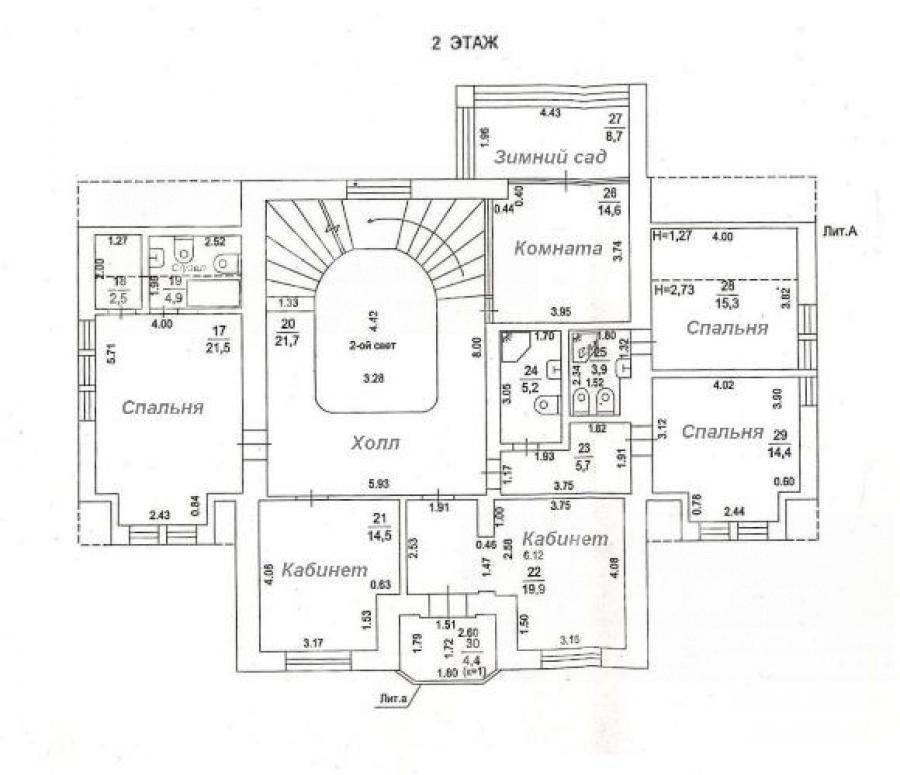 2-ой этаж: холл-галерея 22 кв.м, гостиная 15 кв.м с выходом в зимний сад 9 кв.м, главная спальня 21.5 кв.м с с/узлом 5 кв.м и гардеробной 2.5 кв.м, кабинет 14.5 кв.м, кабинет 20 кв.м с выходом на балкон, с/узел 5 кв.м, спальня 14 кв.м, спальня 15 кв.м с с/узлом 4 кв.м