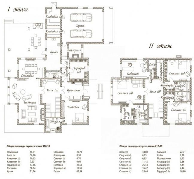 1-ый этаж: прихожая 17 кв.м, холл 31 кв.м, кухня 22 кв.м, столовая 23 кв.м, гостиная 59 кв.м, гардеробная 18 кв.м, гостевая комната 27 кв.м с санузлом 9 кв.м, бойлерная 8 кв.м, гараж 63 кв.м, 2 кладовые 7 и 11 кв.м