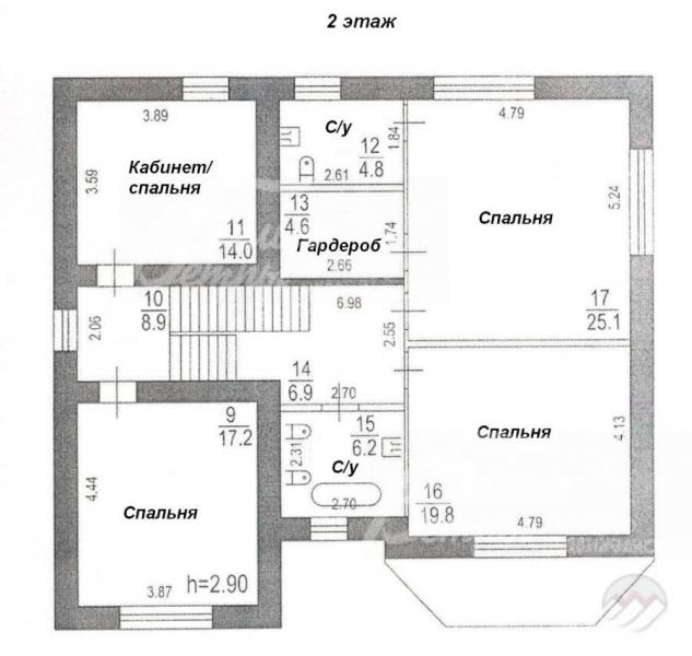 2-ой этаж: Главная спальня 24 кв.м с с/узлом 5 кв.м и гардеробной 5 кв.м, спальня/кабинет 14 кв.м, спальня 17.5 кв.м, спальня 21 кв.м, с/узел 7 кв.м.