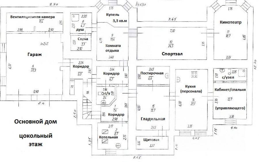 Цоколь: Основной дом: гараж 37 кв.м; с/узел; СПА зона: сауна с купелью, душевая, комната отдыха; спортзал 25 кв.м; кинозал 19 кв.м; котельная 7 кв.м, дополнительная кухня 21 кв.м, постирочная 7 кв.м; гладильная/хозяйственная 16 кв.м; кабинет 13 кв.м с с/узлом.