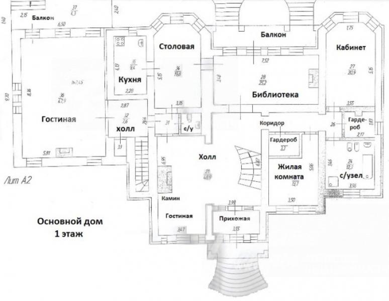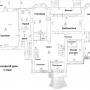 1-ый этаж: Основной дом: тамбур-прихожая, холл-гостиная с камином 49 кв.м, гостевой с/узел, кухня-столовая 10+20 кв.м, библиотека/зал 25 кв.м с камином, Главная гостиная 48 кв.м, кабинет 21 кв.м, гостевая спальня 14 кв.м с с/узлом 12 кв.м, 2 гардеробные по 4 кв.м.