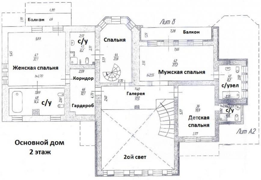 2-ой этаж: Основной дом: холл-галерея 17.5 кв.м, мужская спальня 27 кв.м со своей ванной комнатой 8 кв.м и балконом, женская спальня 32 кв.м со своей ванной комнатой 14 кв.м, гардеробной 12 кв.м и балконом, спальня 22 кв.м с с/узлом 8 кв.м и расположенным над спальней кабинетом/комнатой отдыха 27 кв.м, спальня 20 кв.м с с/узлом 4 кв.м