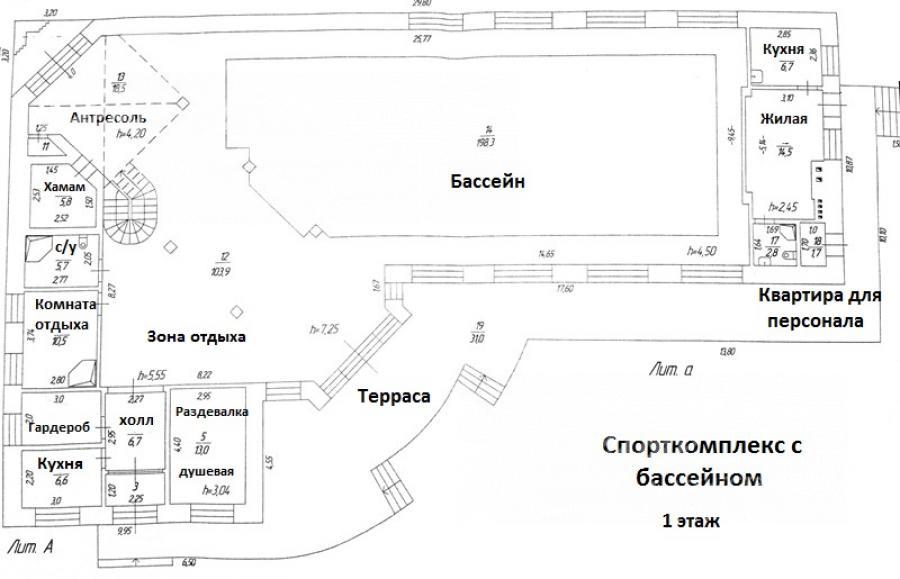 Дополнительные строения: Здание бассейна 514 кв.м: чаша бассейна 20м*8м; зона отдыха вокруг чаши 104 кв.м; вспомогательные помещения: кухня 7 кв.м, раздевалки с душевыми и санузлами, комната отдыха на антресольном этаже 19 кв.м, хамам. В цокольном этаже: бар с каминным залом 40 кв.м, кухня, санузел.
