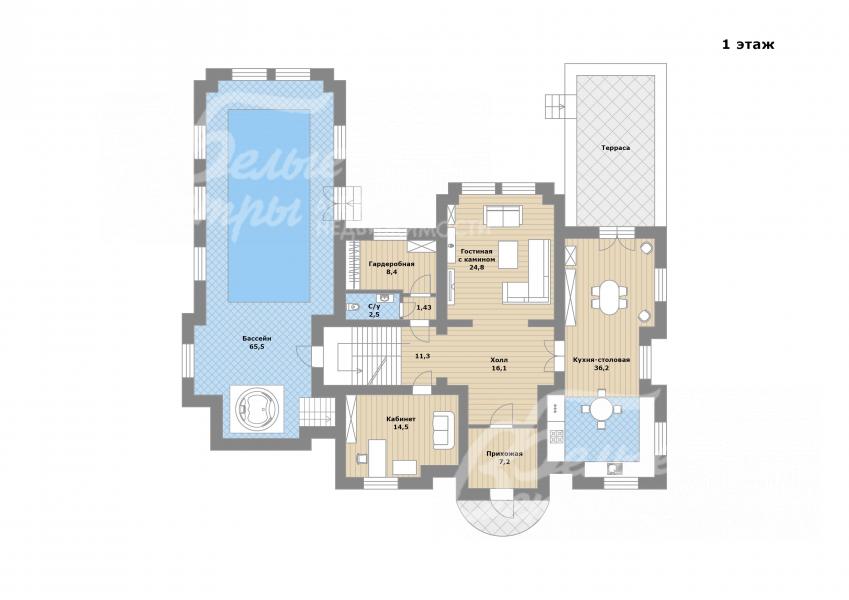 1-ый этаж: прихожая 7 кв.м, холл 16 кв.м, гостиная 25 кв.м с камином, кухня-столовая 36 кв.м с выходом на просторную террасу, гардеробная 8 кв.м, кабинет 15 кв.м, гостевой санузел 3 кв.м, крытый бассейн 66 кв.м с джакузи.