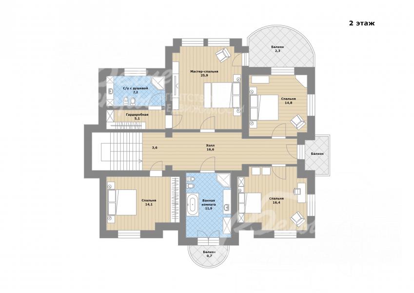 2-ой этаж: холл 17 кв.м, хозяйская спальня 25 кв.м с гардеробной 5 кв.м, санузлом 7 кв.м с душевой кабиной и с балконом 8 кв.м, три спальни 14, 15, 16 кв.м, ванная комната 12 кв.м с балконом.