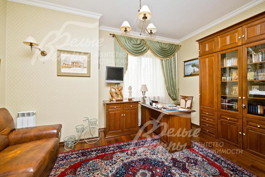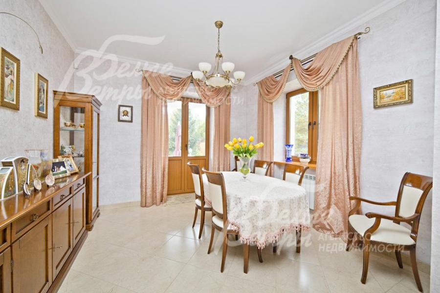 Описание внутренней отделки: выполнена отделка в классическом стиле с использованием дорогих натуральных материалов. Стены: декоративный камень (в бассейне), обои, декоративная штукатурка. На полу паркет (кабинет и гостиная), паркетная доска, на кухне и в санузлах - керамогранит (теплый пол) Италия. Деревянный лестничный марш из массива стандартной ширины. Потолки покрашены. Межкомнатные двери из массива дерева, Греция. Подоконники - искусственный мрамор (первый этаж) и массив дерева (второй этаж). Мраморный камин.
