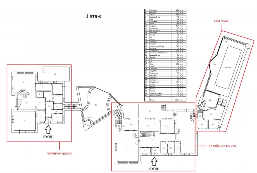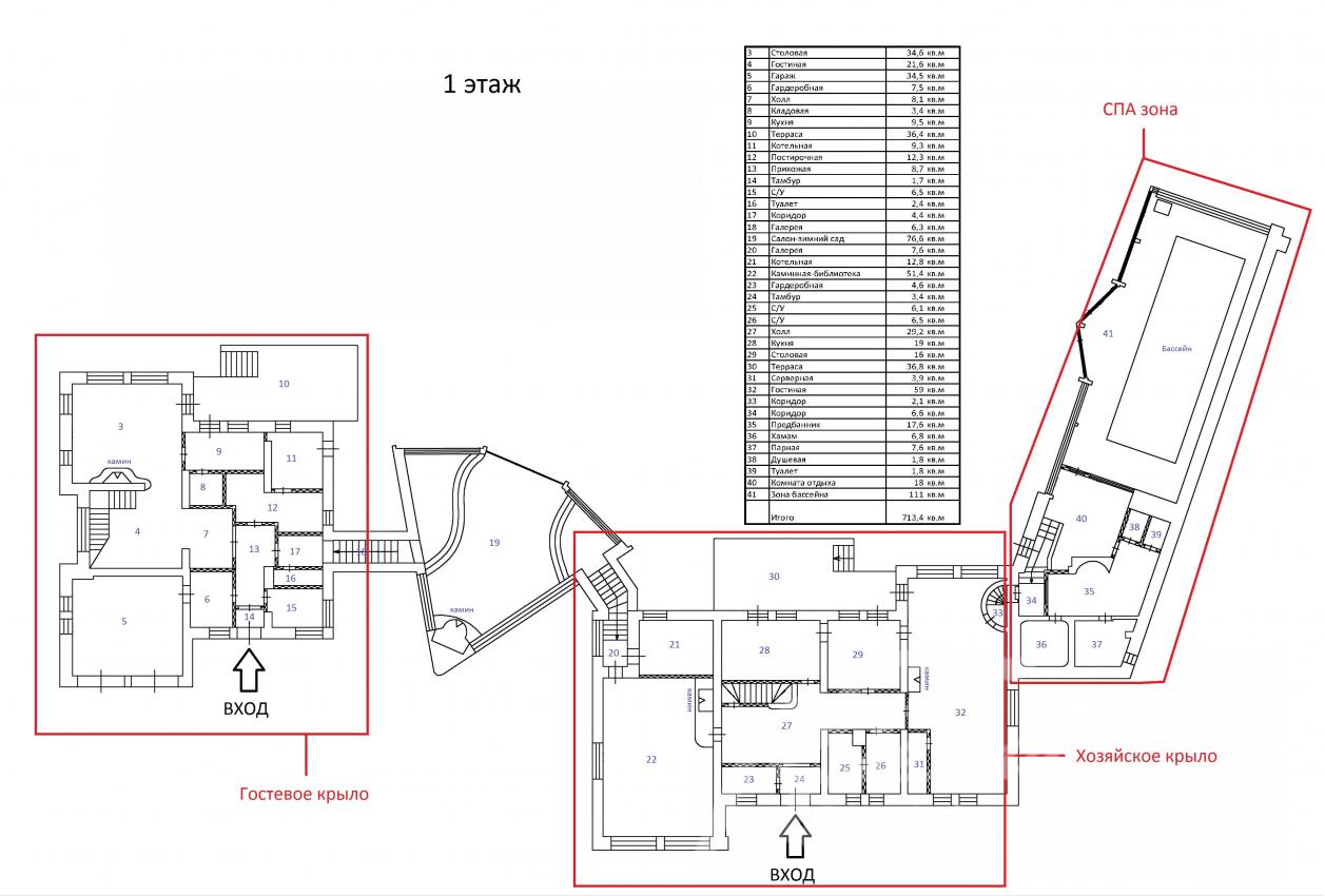 1-ый этаж: Основной дом: прихожая с гардеробной, холл, большой гостевой с/узел, кухня, cтоловая с выходом на террасу, гостиная с выходом в зону бассейна и Спа (две бани: сауна и хамам, джакузи), каминный зал (через него проход в Гостевой дом), большой зал с панорамным остеклением и камином, котельная.