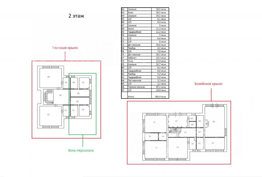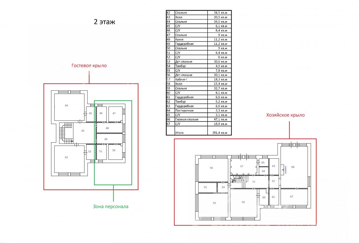 2-ой этаж: Основной дом: две детские спальни с с/узлом, спальня с с/узлом, кабинет с с/узлом, спальня хозяев с с/узлом и двумя гардеробными, прачечная-гладильная.
