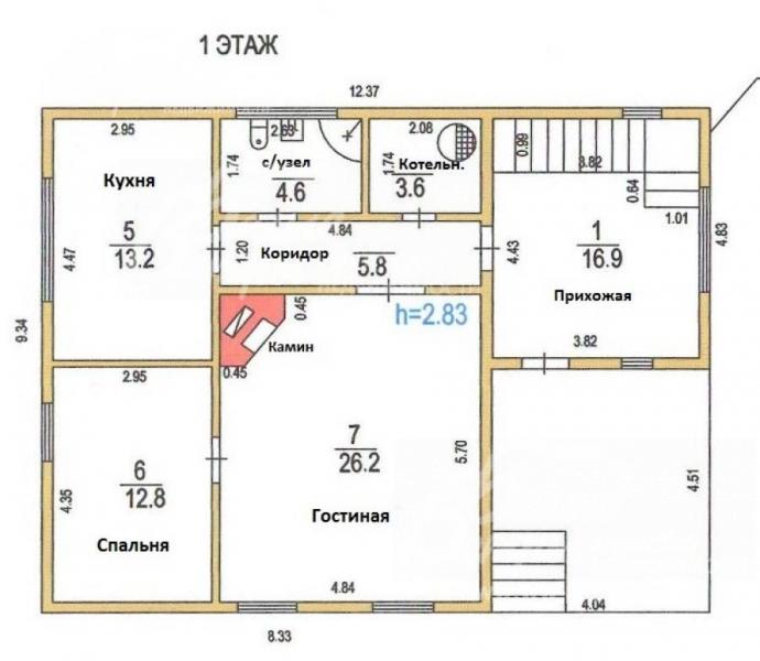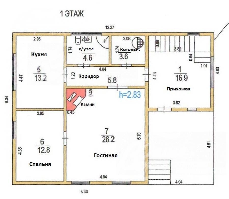 1-ый этаж: прихожая 17 кв.м, гостиная с камином 26 кв.м, кухня 13 кв.м, гостевая спальня 13 кв.м, с/узел 4.6 кв.м (с душевой кабиной), котельная 3.6 кв.м
