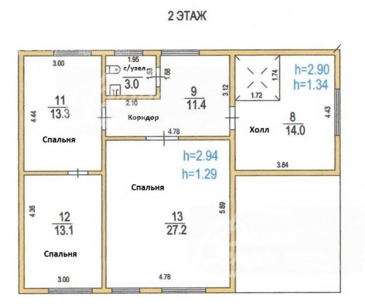 2-ой этаж: холл 14 кв.м, спальня 27 кв.м, две спальни по 13 кв.м, с/узел