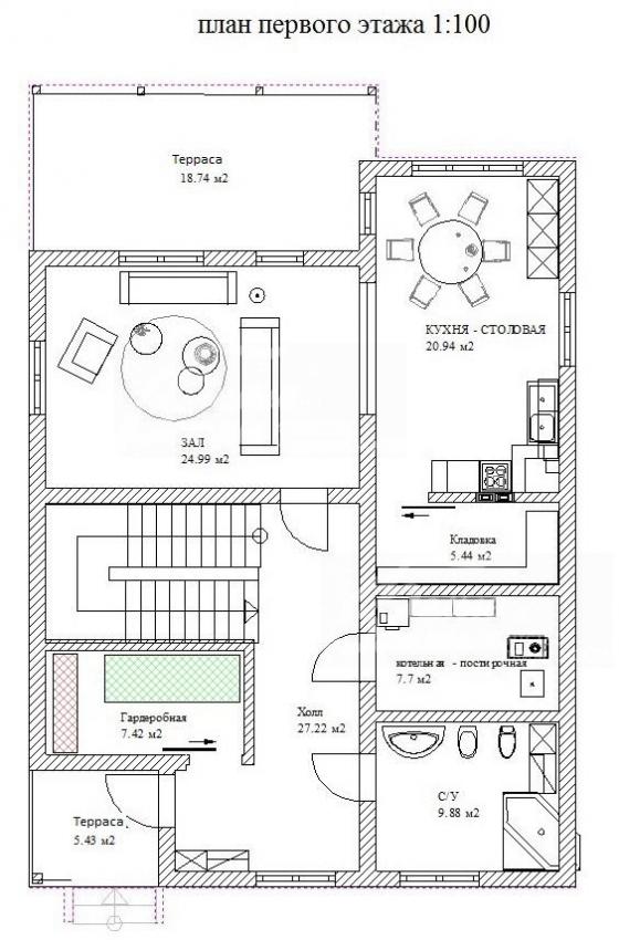 1-ый этаж: крыльцо 5 кв.м, холл 27 кв.м, гардеробная 7 кв.м, котельная-постирочная 8 кв.м; санузел 10 кв.м, гостиная 25 кв.м, кухня - столовая 21 кв.м, кладовка 5 кв.м, терраса 18 кв.м;