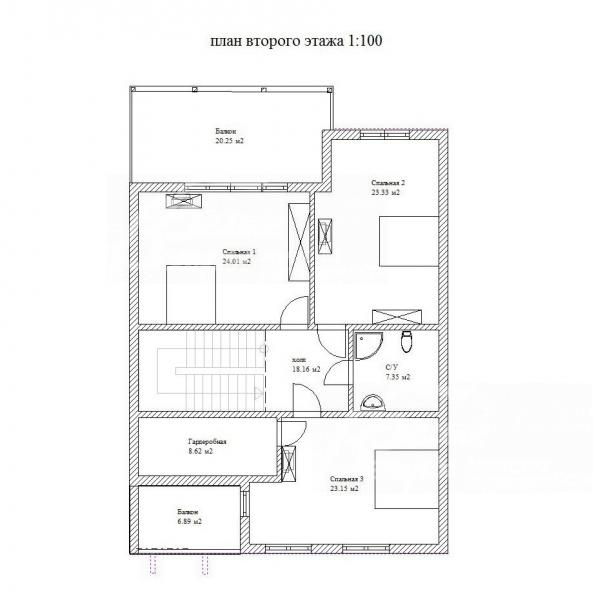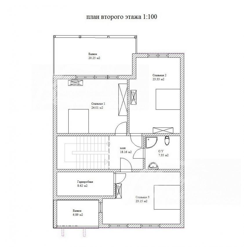 2-ой этаж: балкон 20 кв.м, спальня 24 кв.м, холл 18 кв.м, санузел 7 кв.м, спальня 23 кв.м, спальня 23 кв.м, гардеробная 9 кв.м; балкон 7 кв.м;