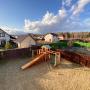 Благоустройство участка: ровный огороженный участок с газоном, высажены 9 сосен, 1 ель. Есть стоянка для авто. На территории установлена детская игровая площадка Савушка-15 с зимней и летней горками;