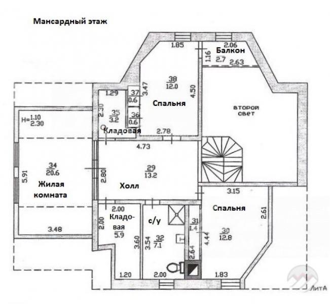 2-ой этаж: второй свет с балконом, холл 13 кв.м, спальня 13 кв.м, с/узел 7 кв.м, кладовая 6 кв.м, детская спальня 12 кв.м, кладовая, жилая комната 20.5 кв.м