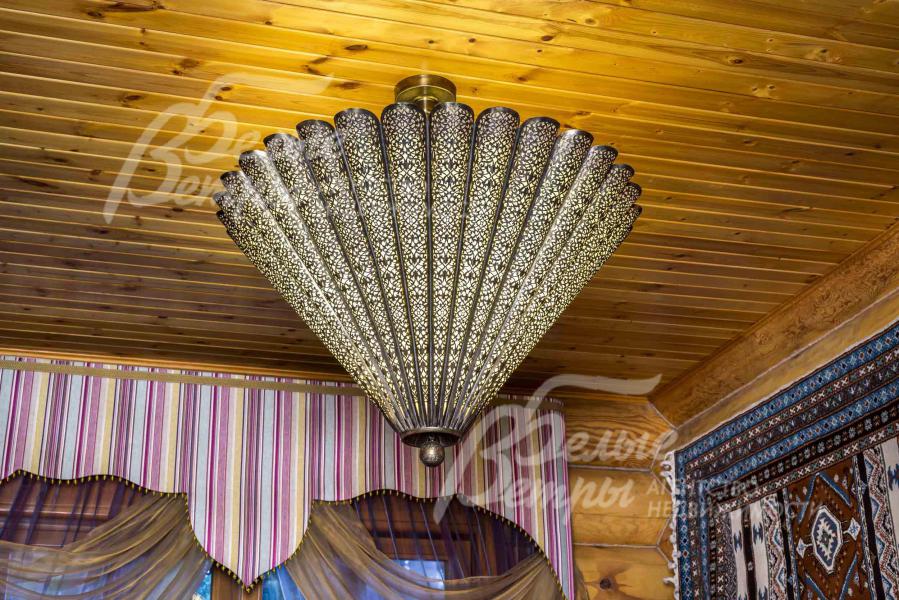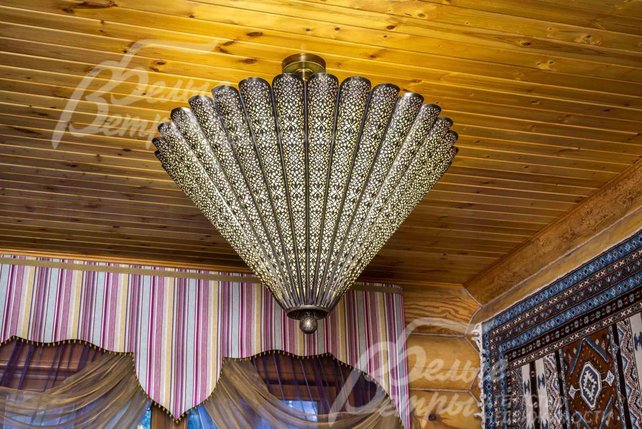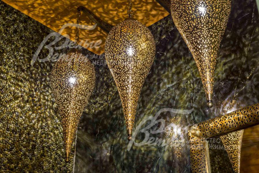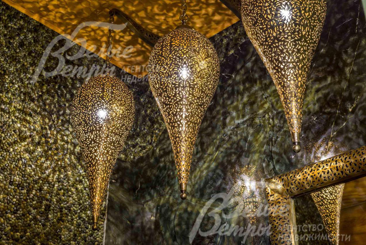 В доме для приемов гостей: оригинальный гарнитур - огромный стол и 14 стульев из дуба с резьбой; десертный стол со столешницей из природного оникса; мебель чайной комнаты (стол, диван), сделанная на заказ по фото старинных образцов; кухонный гарнитура из мореного 600-летнего дуба; декоративные подушки ручная работа; аутентичные аксессуары и светильники из Марокко.