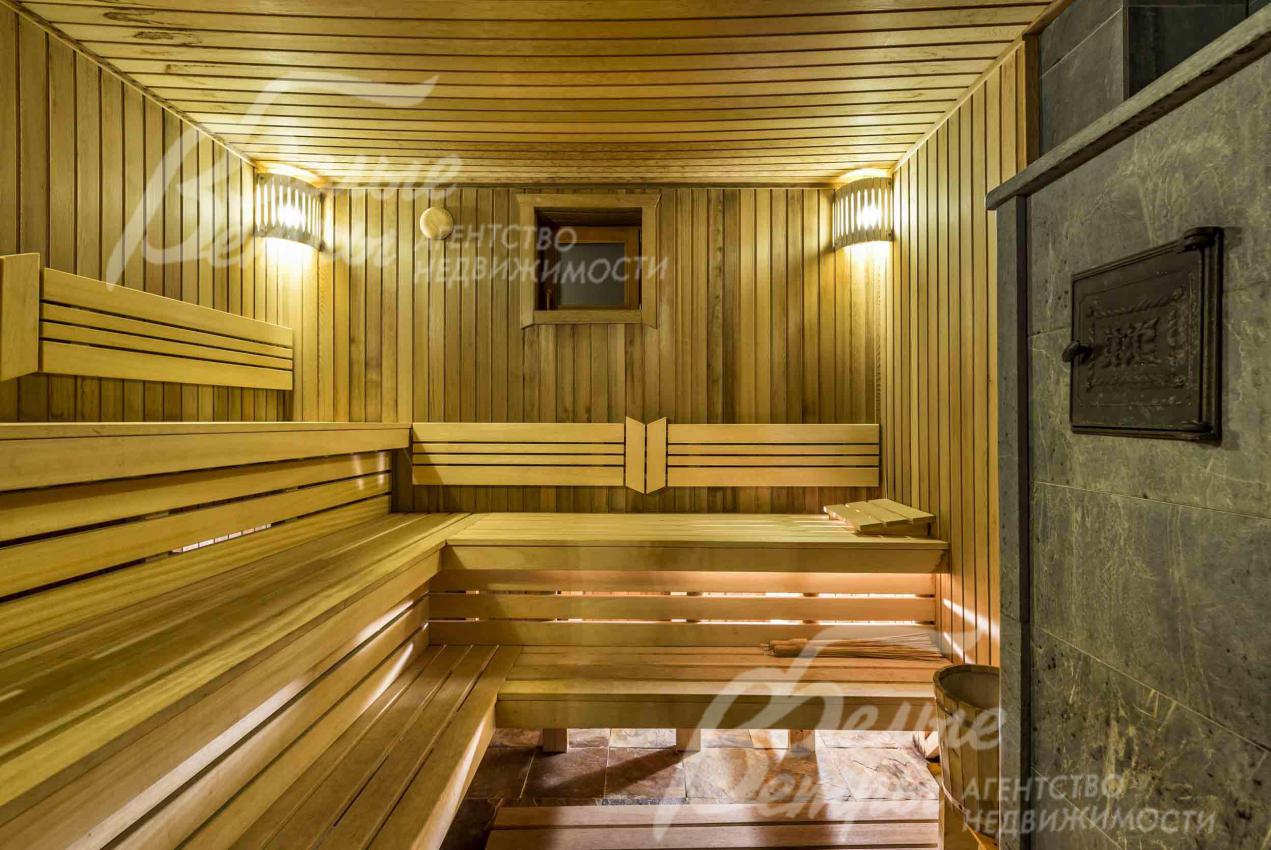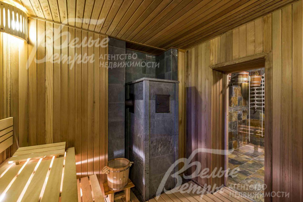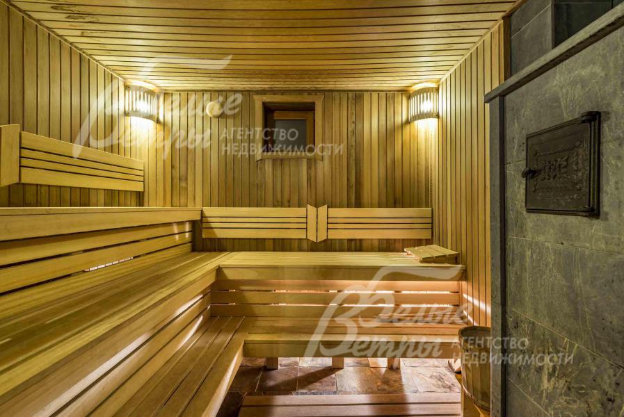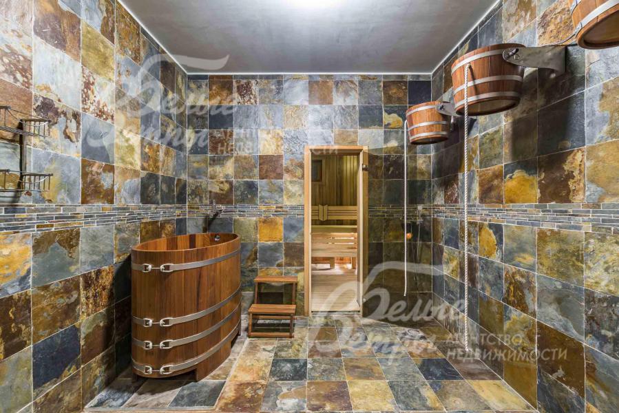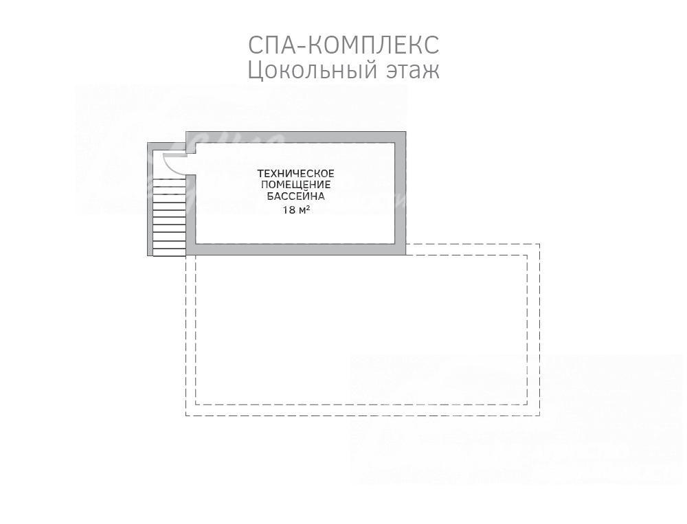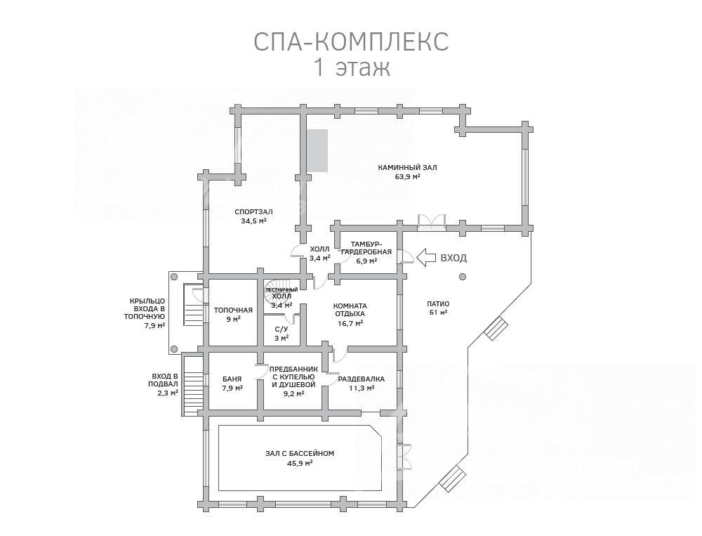 1 этаж: тамбур, холл, каминный зал 70 кв.м с печью, мангалом, казаном, коптильней и электрическим вертелом, спортивный зал (или спальня) 35 кв.м. В СПА-зоне: скиммерный бассейн с противотоком 46 кв.м (7х3 м, глубина 1,7 м), с выходом на летнее патио 61 кв.м, раздевалка 11 кв.м, предбанник с душевой, деревянной купелью и тремя обливочными вёдрами, русская парная с каменной печью на дровах (на 7 человек), марокканская чайная (комната отдыха) 17 кв.м и санузел, лестничный холл.