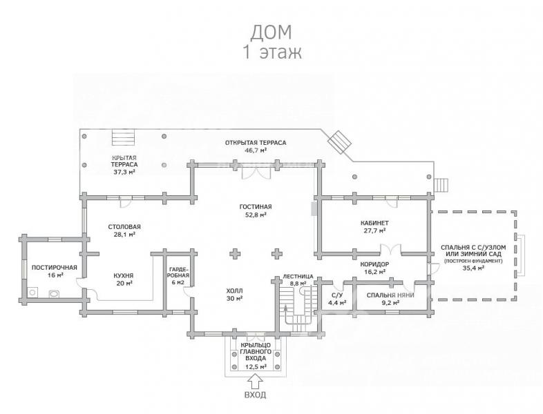 1-ый этаж: Крыльцо 13 кв.м, холл-прихожая 30 кв.м с гардеробной 6 кв.м, двусветная гостиная 53 кв.м с камином и выходом на открытую террасу 47 кв.м, столовая 28 кв.м с выходом на крытую террасу 37 кв.м, кухня 20 кв.м, лестничный холл 9 кв.м, коридор 16 кв.м, кабинет-спальня 28 кв.м, спальня няни/гувернантки, с/узел, постирочная 16 кв.м и зимний сад или спальня со своим санузлом 35,4 кв.м (построен фундамент и подведены коммуникации все)