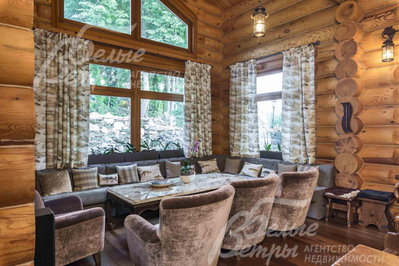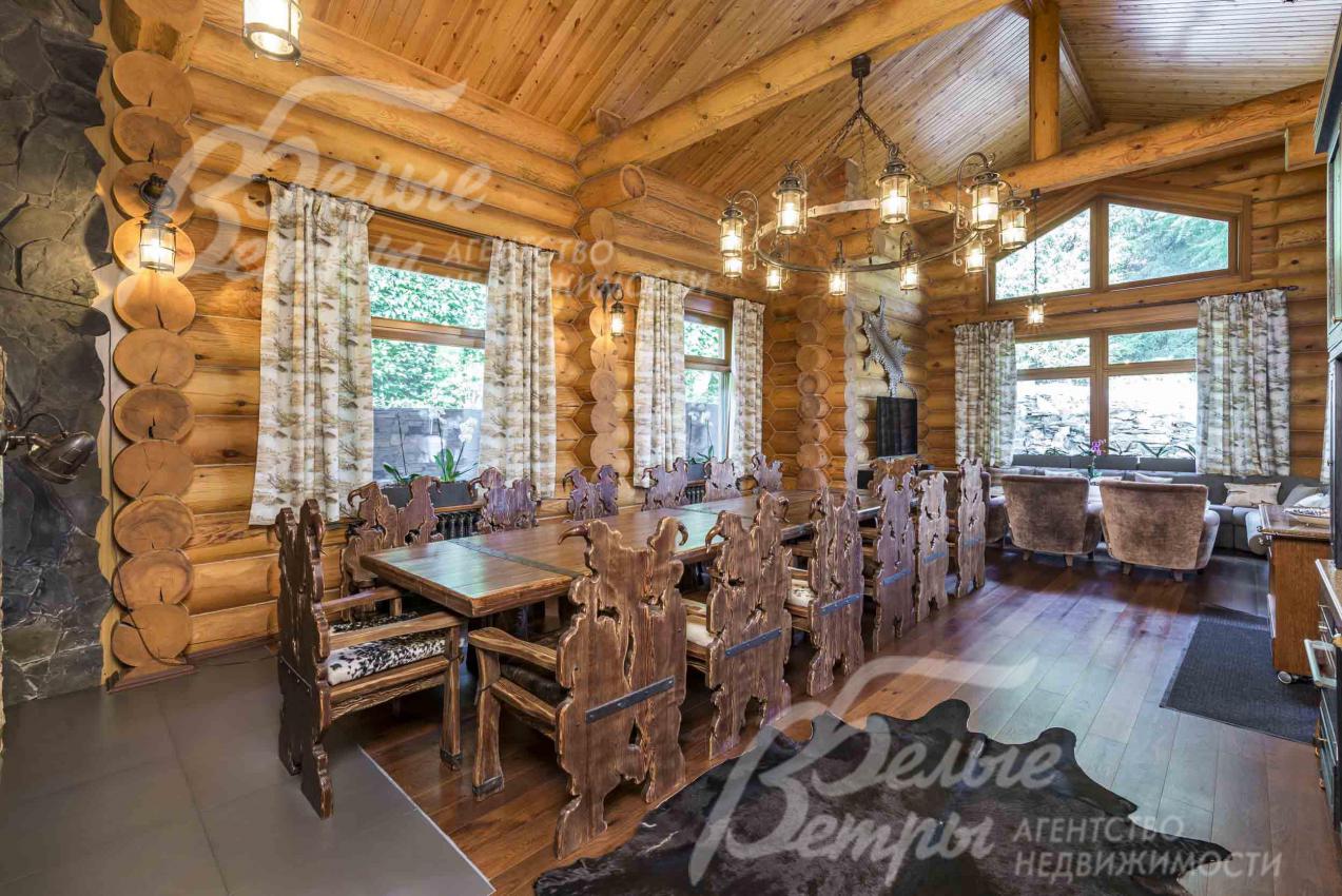 Дубовые двери (толщина полотна 60 мм, высота проёма 2,3м). Подоконники из лиственницы. Лестница широкая и удобная, также из лиственницы, ступеньки выполнены из распиленных пополам бревен, а перила - мастерски переплетенные ветки. Кроме бревен стены, а также пол отделаны натуральным сланцем. В хозяйской спальне одна стена - фиолетовым сланцем «горбушка». В гостиной, кухне и столовой пол - черный сланец (с водяным подогревом). Пол и стены банного комплекса - из красивейшего индийского сланца. В санузлах пол и стены - из натурального сланца, мозаики, мраморных слэбов, архитектурного бетона. В остальных жилых комнатах на полах благородный и тёплый массив дубовой доски (красное дерево).