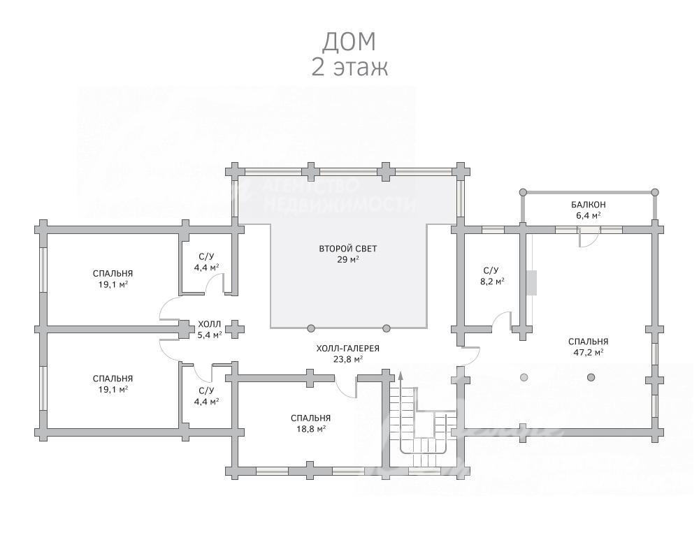 2-ой этаж: Холл-галерея 24 кв.м, главная спальня 47 кв.м со своим с/узлом 9 кв.м и выходом на балкон, 3 спальни (18,8 кв.м, 19 кв.м и 19 кв.м) со своим холлом и 2 санузлами