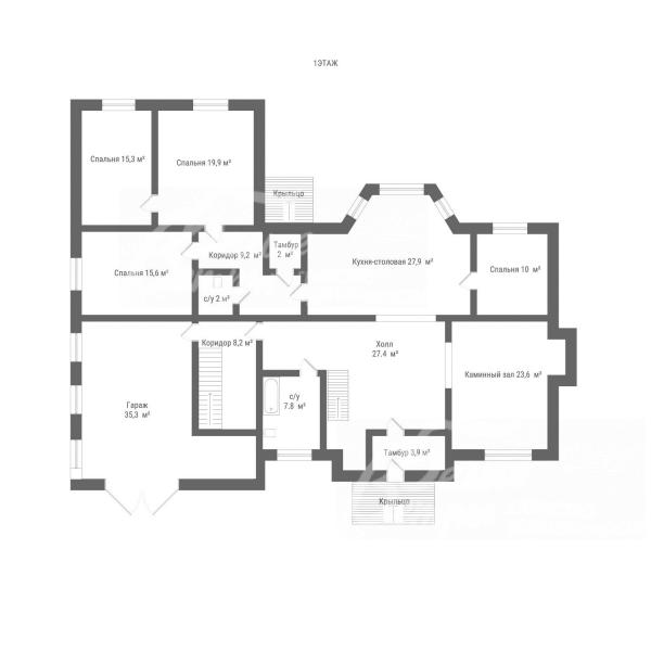 1-ый этаж: тамбур 4 кв.м, холл 27 кв.м, каминный зал 24 кв.м, санузел 8 кв.м, кухня-столовая 28 кв.м, спальня 10 кв.м, коридор 9 кв.м, санузел 2 кв.м, спальня 16 кв.м, спальня 20 кв.м, спальня 15 кв.м, коридор 8 кв.м, гараж 35 кв.м;