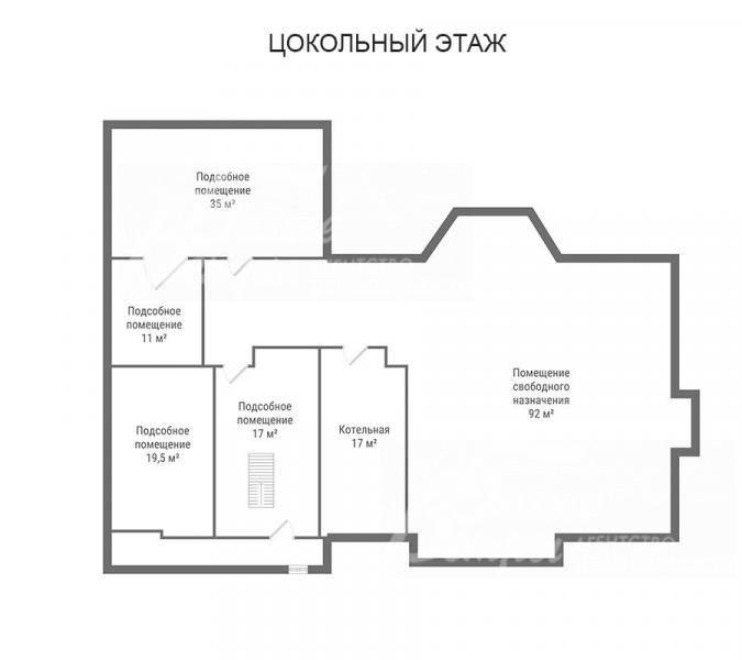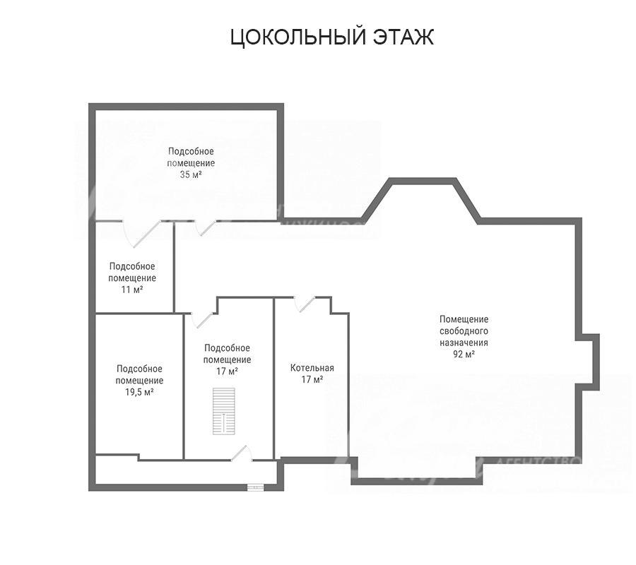 Цоколь: подсобные помещения 17 кв.м, 11 кв.м, 19,5 кв.м, 35 кв.м, котельная 17 кв.м, помещение свободного назначения 92 кв.м;