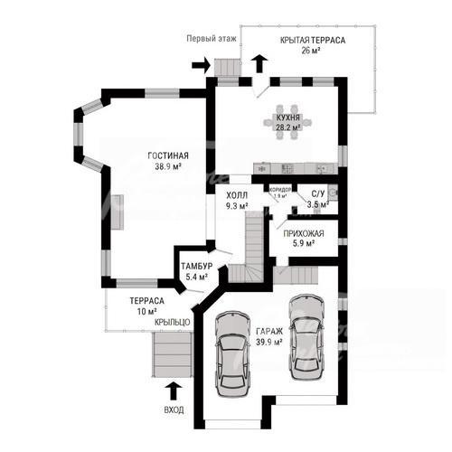 1-ый этаж: теплый гараж на 2 авто 40 кв.м (со своим входом в дом), крытое крыльцо-терраса 10 кв.м, тамбур 5 кв.м, холл 9 кв.м, гостиная 39 кв.м, кухня-столовая 28 кв.м с выходом на террасу 22 кв.м, гостевой санузел 4 кв.м, гардероб 6 кв.м