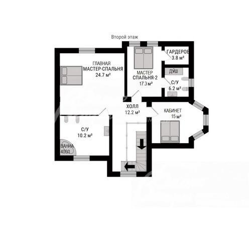 2-ой этаж: холл 12 кв.м, Главная спальня 21 кв.м со своими гардеробной 3 кв.м и санузлом 10 кв.м (с ванной), мастер-спальня 15 кв.м со своими гардеробной 4 кв.м и санузлом 6 кв.м (с душевой кабиной), спальня 17 кв.м
