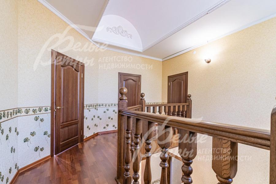 Описание внутренней отделки: выполнена отделка из дорогих натуральных материалов в стиле современной классики. Стены цокольного этажа отделаны пробковым покрытием, котельная и санузлы - плиткой, на первом этаже и в спальнях поклеены обои.