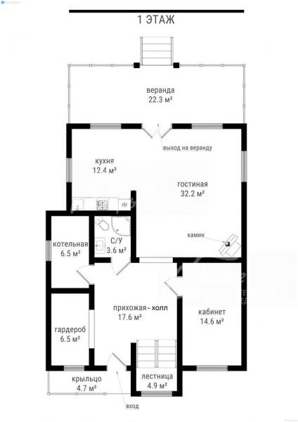1-ый этаж: крыльцо 5 кв.м, гардеробная 7 кв.м, прихожая 18 кв.м, лестница 5 кв.м, санузел 4 кв.м, кабинет 15 кв.м, кухня 12 кв.м, гостиная 32 кв.м, котельная 7 кв.м, веранда 22 кв.м.