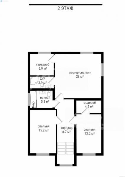 2-ой этаж: коридор 9 кв.м, санузел 5 кв.м, мастер-спальня 28 кв.м со своей гардеробной 7 кв.м и санузлом 4 кв.м, спальня 15 кв.м, спальня 13 кв.м с гардеробом 4 кв.м.