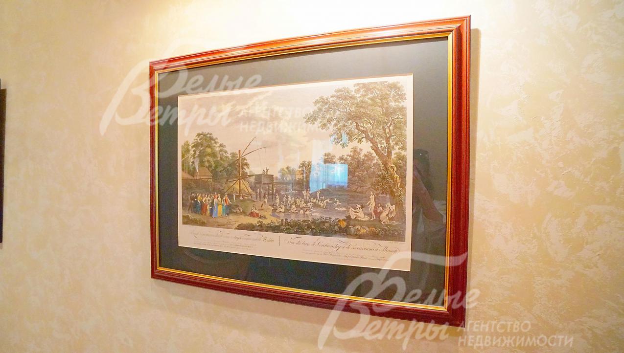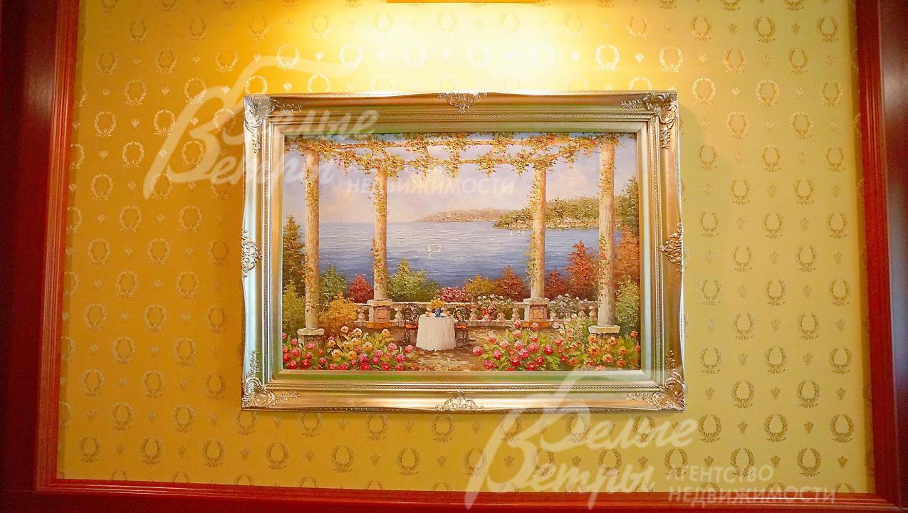 Итальянский кухонный гарнитур в классическом стиле Verona из массива красного дерева, столешница из искусственного камня, со встроенной бытовой техникой Miele, 2 больших холодильника и морозилка, встроенная пароварка и СВЧ. Дизайнерские шторы во всех комнатах. Картины 20 шт испанских художников (виды и мотивы Испании и Франции). Дорогие импортные светильники. В столовой мраморный мангал.