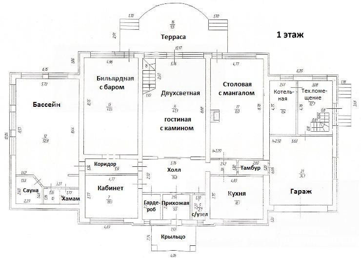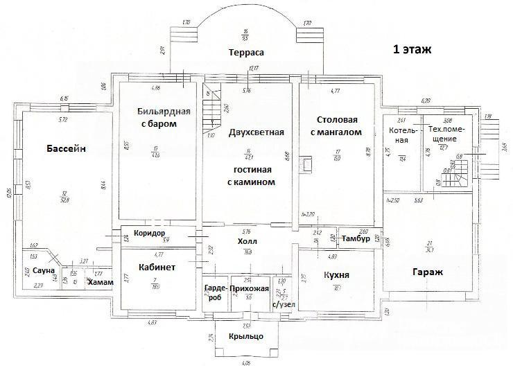 Основной дом: крыльцо 9 кв.м, прихожая 6 кв.м, холл 17 кв.м, гардеробная 4 кв.м, гостевой с/узел 3 кв.м, кабинет 18 кв.м, коридор в левое крыло 6 кв.м, бильярдная с баром 42 кв.м с выходом на террасу, двухсветная гостиная с камином 47 кв.м с выходом на террасу, столовая с мангалом и выходом на террасу, открытая терраса 32 кв.м, коридор, тамбур перед гаражом, кухня 18 кв.м.