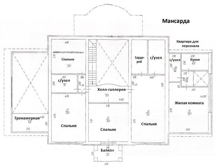 2-ой этаж: Правое крыло дома: квартира для персонала (коридор 4 кв.м, кухня 6 кв.м, с/у 6 кв.м, жилая комната 34 кв.м).