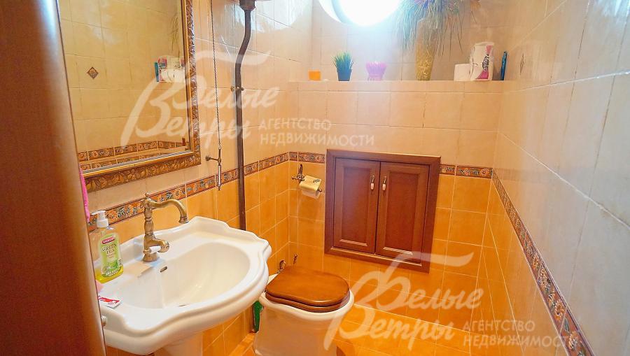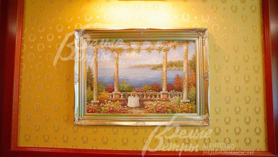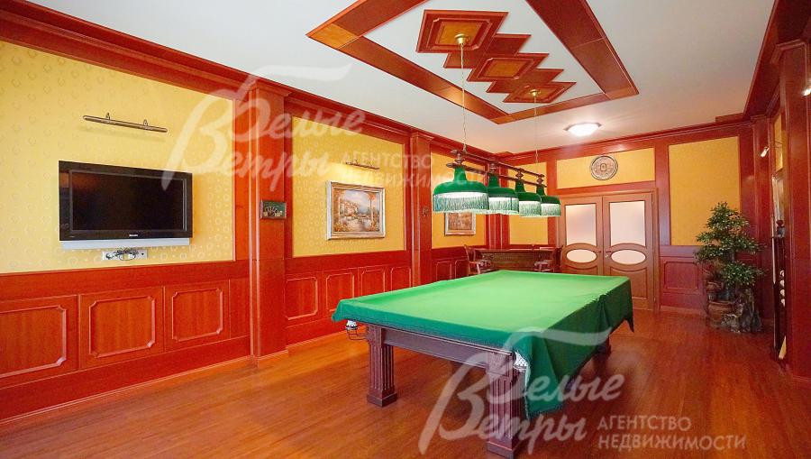 Описание внутренней отделки: Дорогостоящая отделка в классическом стиле с дизайнерскими элементами. Обои и дорогая декоративная венецианская штукатурка с элементами художественной фрески на стенах. В бильярдной отделка красным деревом. На полу - паркет ценных пород дерева Мербау, керамогранит и мрамор с водяным подогревом. Деревянная лестница из африканского дуба шириной 1 м, с дубовыми перилами. Сантехника Bandini Old England. Дубовые двери (Италия). Mраморные подоконники Crema marfili. В бассейне выполнено панно из плитки с видом замка.
