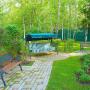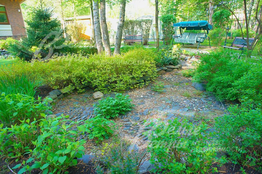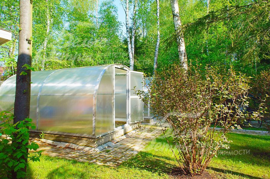 Благоустройство участка: На участке дорожки, стоянка для 3-4 гостевых а/м, посадки, 2 теплицы для овощей, сухой ручей, фонтанчик, большое количество туй по периметру участка, множество декоративных кустарников, розарии.