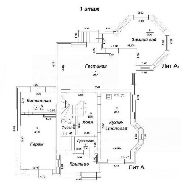 1-ый этаж: входная группа: крыльцо 4 кв.м, прихожая 5 кв.м, холл 13 кв.м, кухня-столовая 24 кв.м, гостиная 31 кв.м (с выводом под камин) с выходом в зимний сад 20 кв.м, гостевой с/узел 3 кв.м, гараж на 1 а/м 21.5 кв.м, котельная 8 кв.м