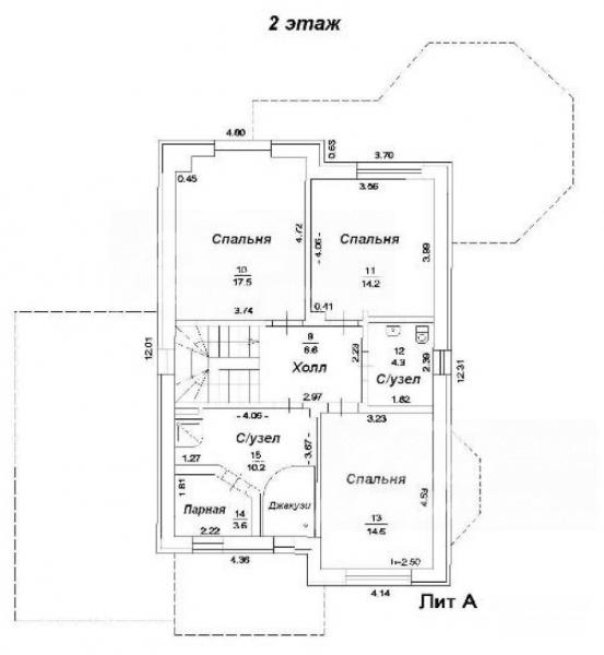 2-ой этаж: спальня 17.5 кв.м, спальня 14 кв.м, спальня 15 кв.м, с/узел 4 кв.м, ванная комната 14 кв.м (сауна, джакузи, душевая), холл 6.6 кв.м