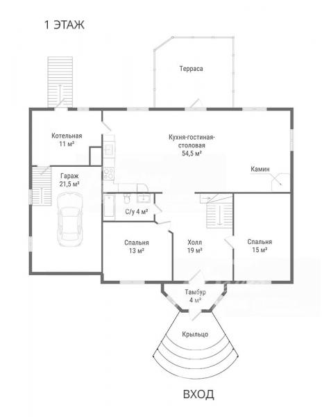 1-ый этаж: тамбур 4 кв.м, холл 19 кв.м, кухня-столовая-гостиная 54,5 кв.м, спальня 13 кв.м, спальня 15 кв.м, санузел 4 кв.м, гараж 21,5 кв.м, котельная 11 кв.м, терраса