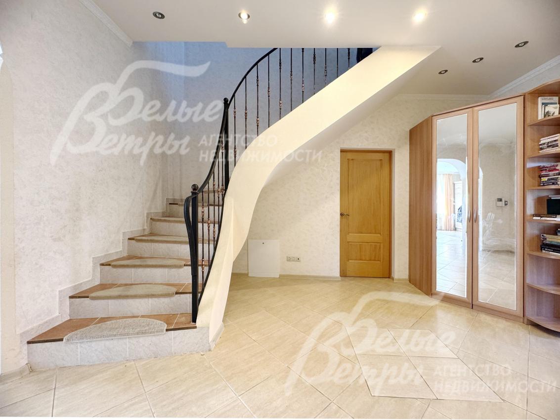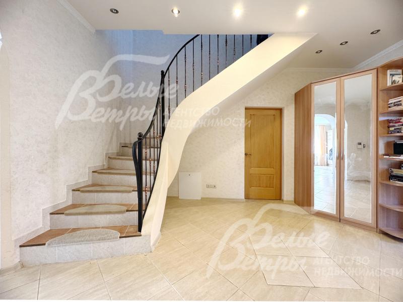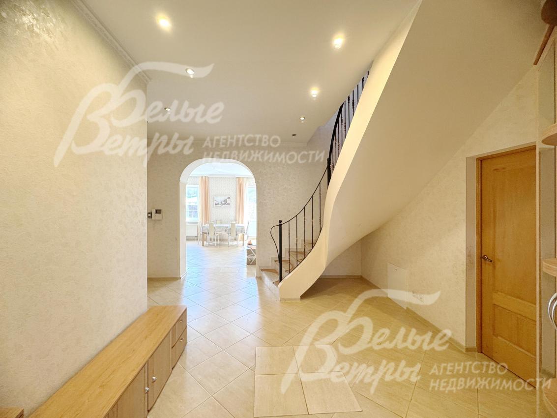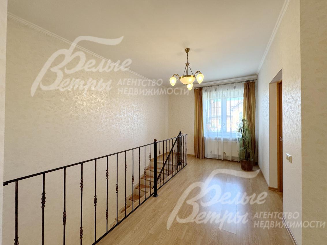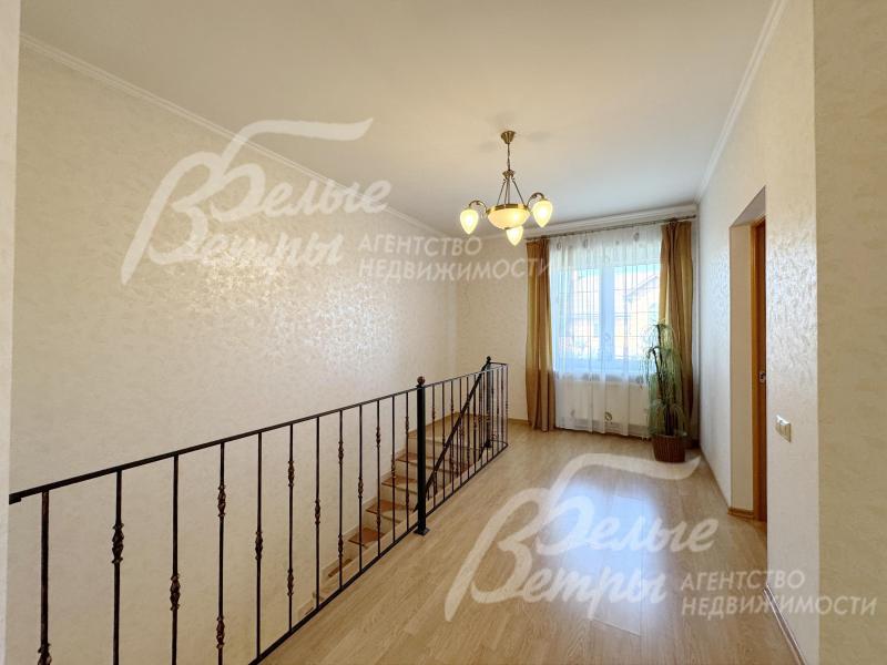 Описание внутренней отделки: в доме выполнена отделка под ключ в классическом стиле: на стенах поклеены обои, на полу в прихожей, гостиной, кухне – керамогранит, в спальнях – ламинат, потолки – из гипсокартона со встроенными светильниками. Установлены двери МДФ, подоконники ПВХ, стальные панельные радиаторы. На второй этаж ведёт монолитная лестница с коваными перилами, отделанная керамогранитом