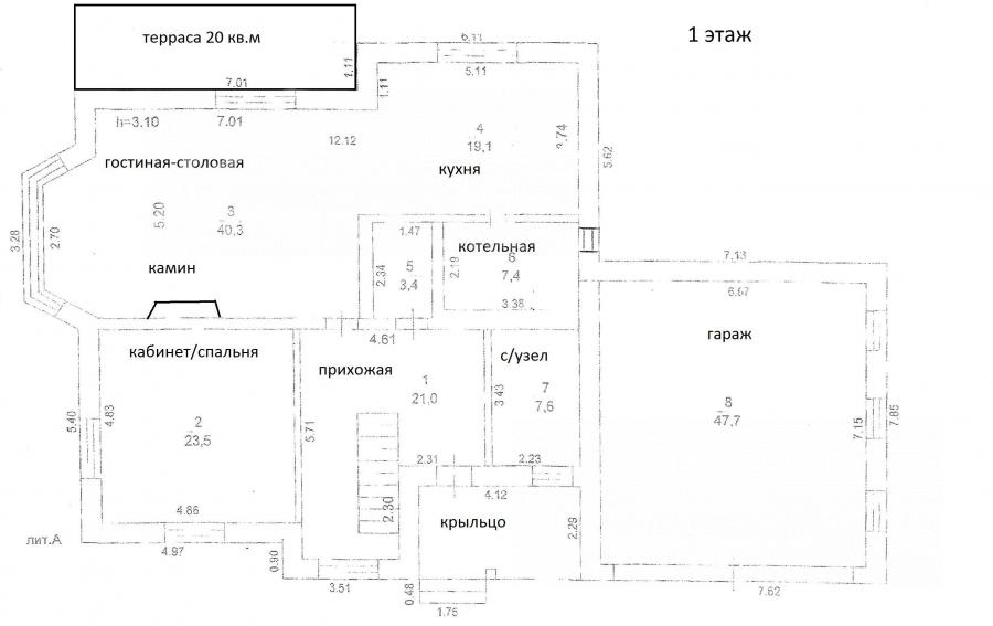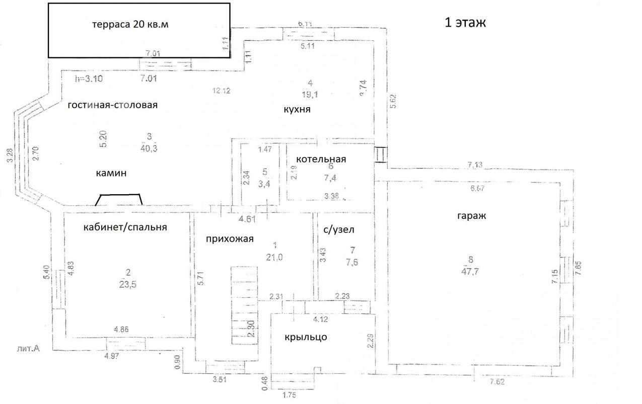 1-ый этаж: Крыльцо, прихожая 21 кв.м, санузел 7.6 кв.м, спальня-кабинет 23.5 кв.м, гостиная-столовая 40 кв.м, кухня 19 кв.м, гардеробная, котельная 7.4 кв.м, гараж 47.7 кв.м, терраса 20 кв.м.
