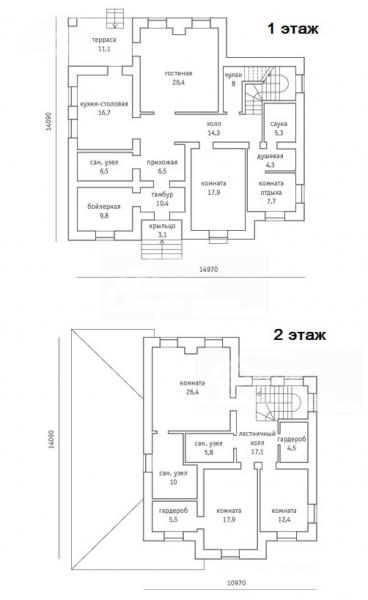 1-ый этаж: крыльцо 3 кв.м, тамбур 10 кв.м, прихожая 7 кв.м, холл 14 кв.м, кухня-столовая 17 кв.м с выходом на крытую террасу 11 кв.м, гостиная 26 кв.м, кабинет/спальня 18 кв.м, с/у 7 кв.м, сауна 5 кв.м, комната отдыха 8 кв.м, душевая 4 кв.м, бойлерная 10 кв.м, кладовка 8 кв.м