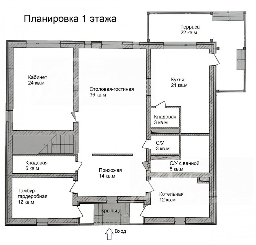 1-ый этаж: прихожая 14 кв.м, гардеробная 12 кв.м, гостиная 36 кв.м, кухня-столовая 21 кв.м с кладовой 3 кв.м и с выходом на крытую террасу 22 кв.м, кабинет/спальня 24 кв.м, с/у 3 кв.м, с/у с ванной 8 кв.м, котельная 12 кв.м, кладовая 5 кв.м
