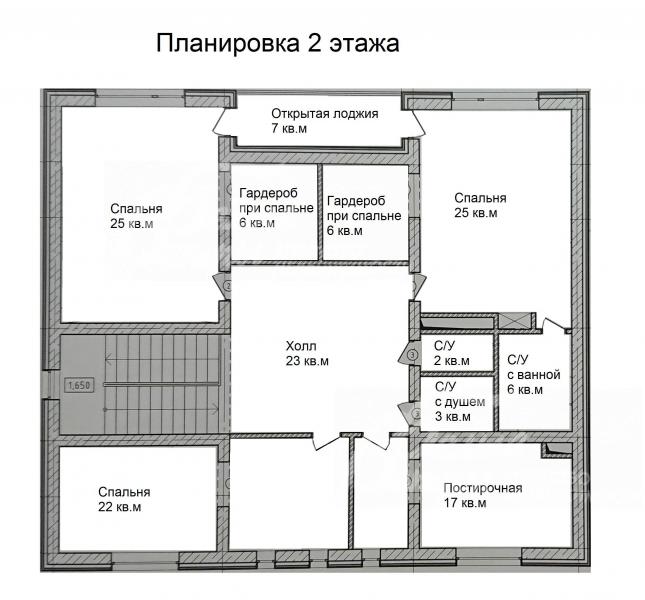 2-ой этаж: холл 23 кв.м, мастер-спальня 25 кв.м со своим с/у 6 кв.м и гардеробной 6 кв.м и с выходом на крытый балкон, спальня 22 кв.м, спальня 25 кв.м с гардеробной 6 кв.м с выходом на балкон 7 кв.м, с/у с душевой 3 кв.м, постирочная 17 кв.м, с/у 2 кв.м