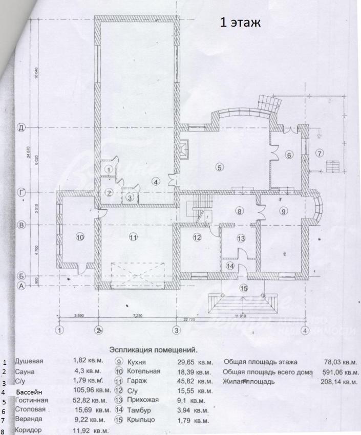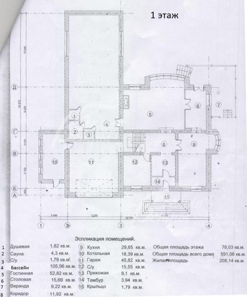 1-ый этаж: Крыльцо, тамбур 4, холл-прихожая 9 кв.м, коридор 12 кв.м, кухня 30 кв.м, гостиная 53 кв.м, столовая 16 кв.м с выходом на веранду 9 кв.м, котельная 18 кв.м, гараж 46 кв.м, душевая 2 кв.м, сауна 4 кв.м, санузел 2 кв.м, бассейн 106 кв.м;