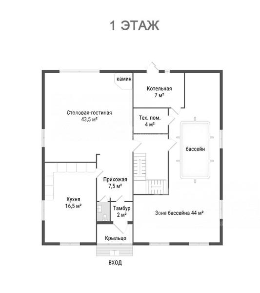1-ый этаж: крыльцо, тамбур 2 кв.м, прихожая 7,5 кв.м, столовая-гостиная 43,5 кв.м, кухня 16,5 кв.м, зона бассейна 44 кв.м, санузел, техническое помещение, котельная 7 кв.м с выходом на участок