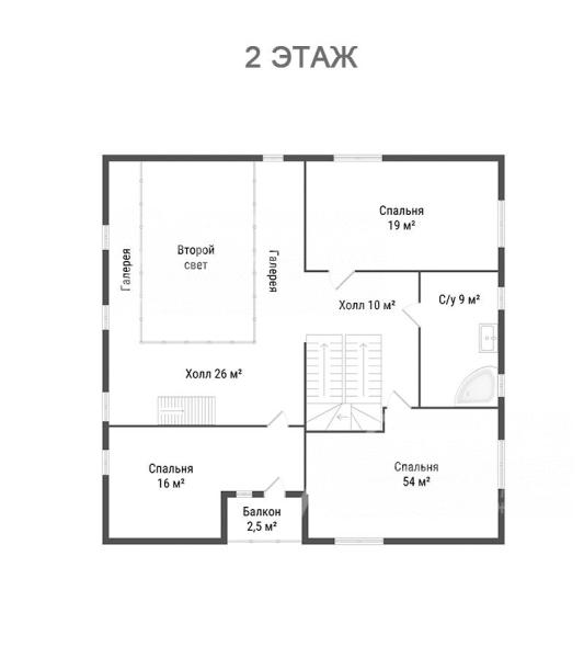2-ой этаж: холл-галерея 26 кв.м, холл 10 кв.м, спальня 16 кв.м с выходом на балкон 2,5 кв.м, спальня 54 кв.м, спальня 19 кв.м, санузел 9 кв.м