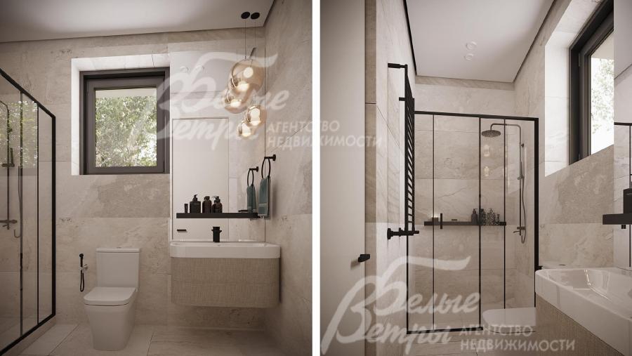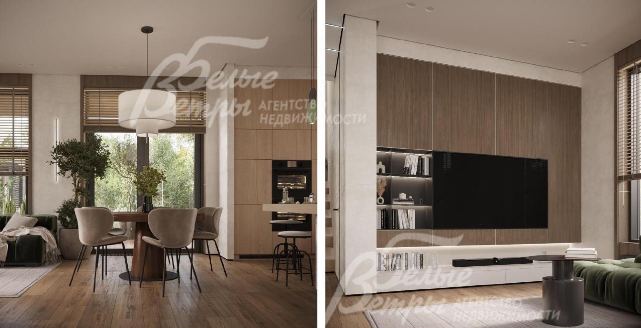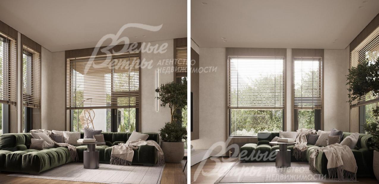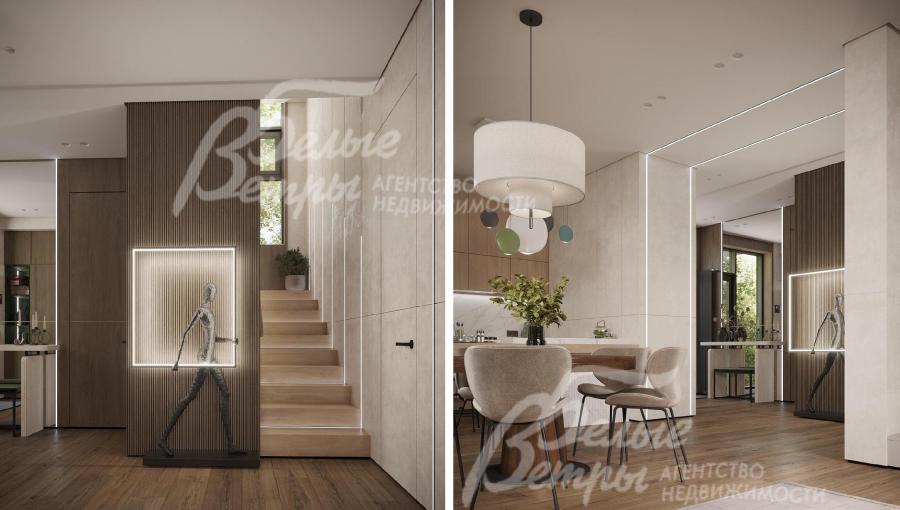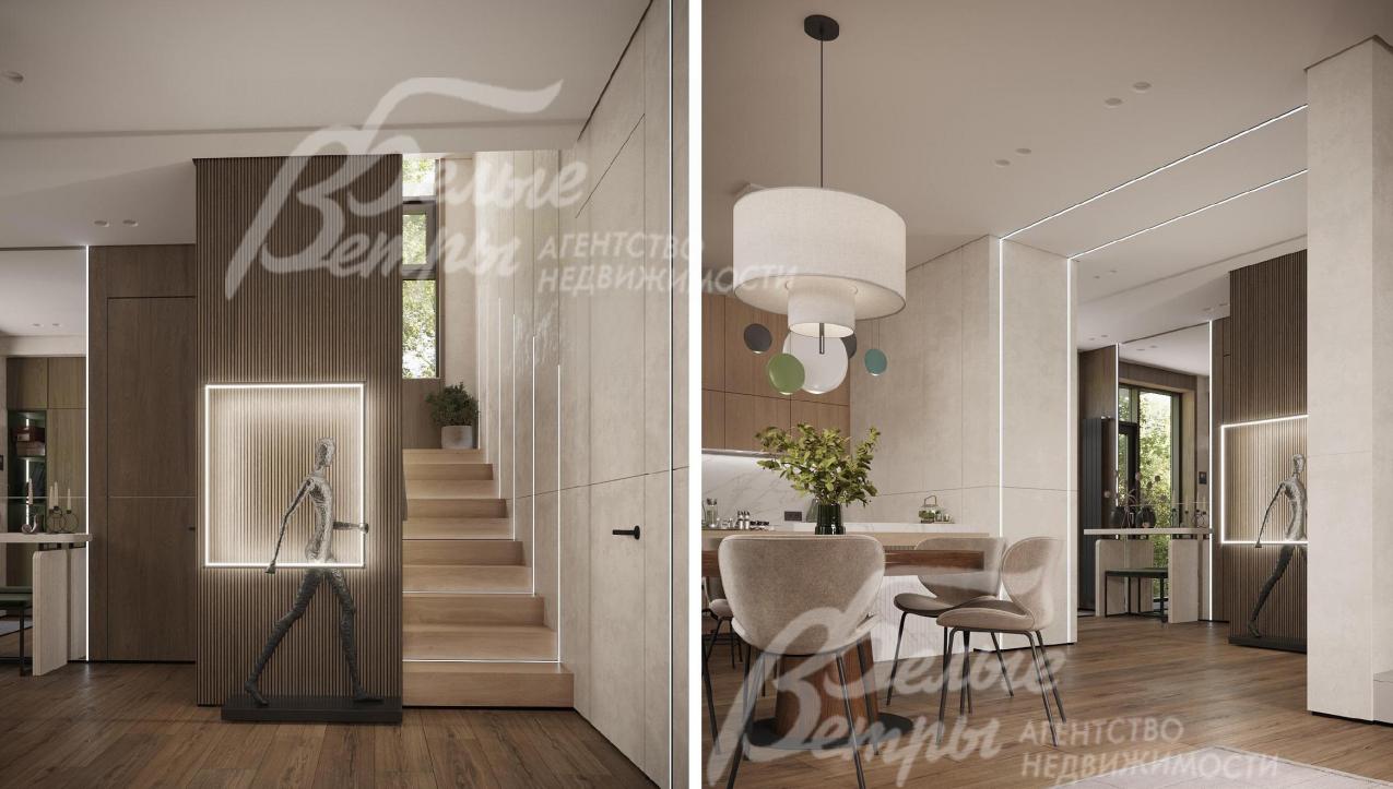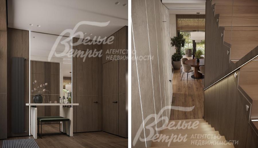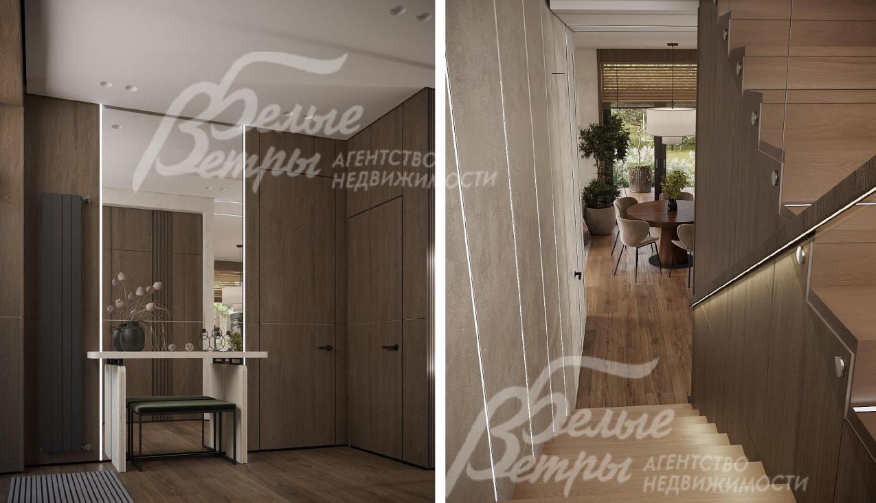 Описание внутренней отделки: выполнена современная стильная отделка под ключ. Стены: в жилых помещениях выкрашены – матовые светлые пастельные оттенки, двери – в цвет стен; в санузлах – крупноформатная плитка серых цветов. На полу: в прихожей, санузлах, гардеробной – плитка с подогревом; в остальных помещениях - дубовая инженерная доска (ламинат). Потолки – натяжные. Установлены: входная дверь и дверь на террасу со стеклом, подоконники около 50 см высотой от пола. На второй этаж ведёт железобетонная монолитная лестница со ступенями, отделанными массивом дуба